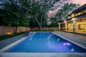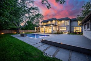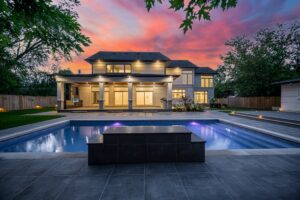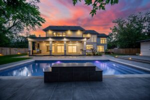 The backyard is designed as a full resort program: covered entertaining, outdoor fireplace wall with TV rough-in, built-in BBQ station, large-format stone terraces, composite sun deck, and a rectangular pool with water feature, plus a pool-house structure for added flexibility. Smart home technology, multi-zone audio, dual HVAC systems, and security surveillance complete a standout offering close to Bronte Village amenities, marinas, and lakefront living.