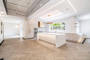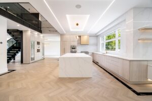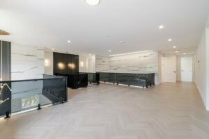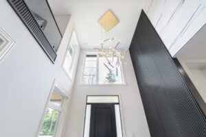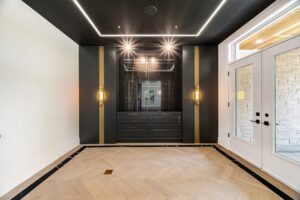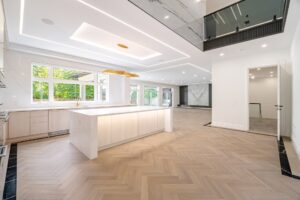 A long private drive with parking for up to 12 cars and an oversized 3-car garage sets the tone. Inside, the double-height foyer and open-riser staircase with smoked glass panels create immediate impact, while tile inlay borders, herringbone engineered hardwood, and architectural lighting carry a consistent, tailored finish throughout. The kitchen anchors the main level with a 10′ quartz island, premium Thermador appliance package, bespoke cabinetry, and a dedicated coffee station—opening seamlessly to the family room with a modern fireplace feature wall and multiple walkouts to the covered portico.